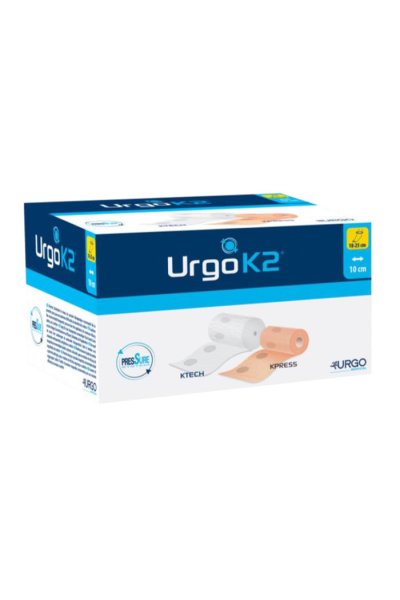 UrgoK2 è un kit di bendaggio compressivo multicomponente che combina due differenti tipologie di bende: una benda interna a corta estensibilità e una benda esterna a lunga estensibilità.