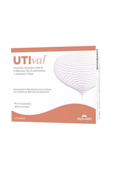 Integratore alimentare a base di D-Mannosio, Palmitoiletanolamide, N-acetilcisteina, Lactobacillus rhamnosus (LR04) microincapsulato e HiBCYN. UTIval è indicato in tutti i casi di insufficiente apporto nella dieta o aumentato fabbisogno di tali nutrienti. Il Lactobacillus rhamnosus favorisce l’equilibrio della flora intestinale. L’estratto di ibisco (HiBCYN) favorisce la funzionalità delle vie urinarie.