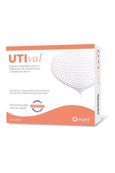 Integratore alimentare a base di D-mannosio, palmitoiletanolamide, N-acetilcisteina, Lactobacillus rhamnosus (LR04) microincapsulato e ibisco (NutriPhy). UTIval è indicato in tutti i casi di insufficiente apporto nella dieta o aumentato fabbisogno di tali nutrienti. Il Lactobacillis rhamnosus favorisce l'equilibrio della flora intestinale. L'estratto di ibisco (NutriPhy) favorisce la funzionalità delle vie urinarie.