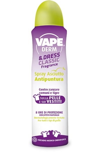 Vape Derm&Dress Spray è un innovativo repellente che può essere applicato sia sulla pelle che sui vestiti, per proteggersi dalle punture di zanzare e altri insetti alati. Questo pratico rimedio ha un effetto fino a 8 ore e il suo principio attivo di origine vegetale lo rende adatto alle pelli più sensibili. Lo spray non macchia né bagna i vestiti.