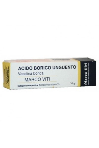 Indicazioni terapeuticheAntisettico per la disinfezione di ustioni minori e di aree cutanee irritate o screpolate. L’unguento ha anche un’azione decongestionante. L’acido borico è indicato come antibatterico per il trattamento dell’acne.