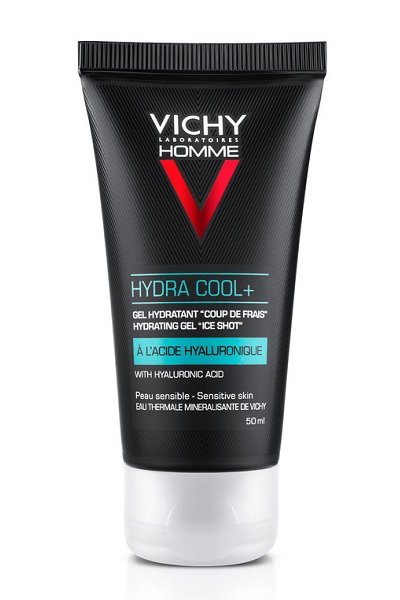 Gel crema idratante viso uomo arricchito con acido ialuronico e acqua termale mineralizzante per una sensazione di freddo e un assorbimento istantaneo (test strumentale).