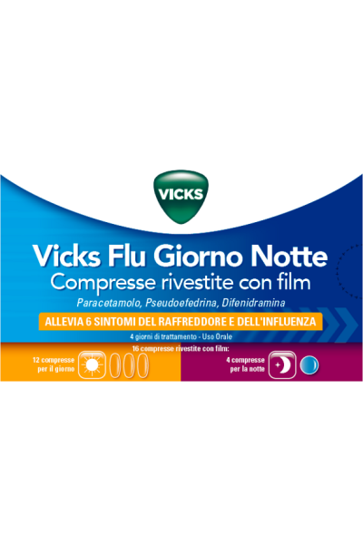 Vicks Flu Giorno Notte è indicato per il trattamento sintomatico a breve termine della congestione nasale e sinusale associata a sintomi di raffreddore e influenza come dolore, mal di testa e/o febbre e solo in combinazione con sintomi di dolore notturno che causano difficoltà ad addormentarsi.
