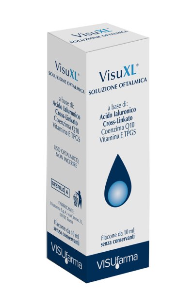 VISUXL è una soluzione oftalmica lubrificante e antiossidante senza conservanti a base di Coenzima Q10, Vitamina E TPGS e Acido Ialuronico sale sodico Cross-Linkato.