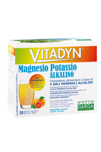 VITADYN è un integratore alimentare di sali alcalini di Magnesio e Potassio. Il Magnesio contribuisce alla riduzione della stanchezza e dell’affaticamento, all’equilibrio elettrolitico, al normale metabolismo energetico ed insieme al Potassio alla normale funzione muscolare. Il Potassio contribuisce al normale funzionamento del sistema nervoso e al mantenimento di una normale pressione sanguigna. Contiene anche Vitamina C utile per proteggere le cellule dallo stress ossidativo e per contribuire alla normale funzione del sistema immunitario.