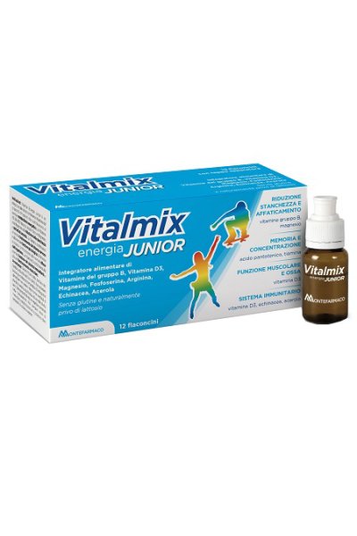 Integratore alimentare contenente vitamine del gruppo B e Magnesio che contribuiscono al normale metabolismo energetico. Le vitamine B2, B6, B12, Niacina, Acido folico e Magnesio contribuiscono alla riduzione della stanchezza e dell'affaticamento. Acido pantotenico e Tiamina contribuiscono al normale funzionamento del sistema nervoso e della funzione psicologico. Echinacea e Acerola contribuiscono alle naturali difese dell'otganismo. Vitalmix Junior può essere utile nei periodi di maggiore dispendio energetico quali studio, attività fisica, gioco, convalescenza e cambi di stagione.