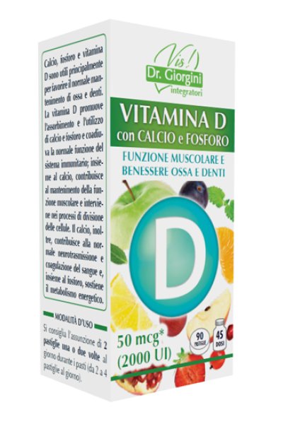Integratore alimentare a base di vitamina D con calcio e fosforo, per la funzione muscolare e il benessere di ossa e denti. Non contiene conservanti, coloranti ed edulcoranti di sintesi. Prodotto adatto ai vegani.