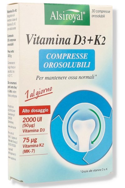 Integratore alimentare in compresse orosolubili a base di vitamina D3 e K2 utile per mantenere ossa forti.
