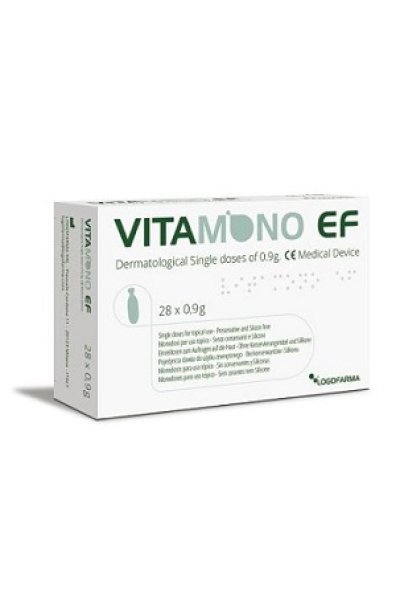VITAMONO EF è un Dispositivo Medico per uso cutaneo a base di vitamina E, vitamina F e Taurina. VITAMONO EF si presenta come lipogel anidro ed è indicato per la stabilizzazione e il ripristino della funzione fisiologica della barriera lipidica cutanea superficiale. La vitamina E in forma libera (non esterificata) comprende due classi di composti: i Tocoferoli e i Tocotrienoli, di cui, questi ultimi, sono presenti in concentrazione più elevata nel dispositivo VITAMONO EF. I Tocotrienoli, presenti quindi sul film lipidico che si forma attraverso l’applicazione di VITAMONO EF sulla superficie della cute integra, favoriscono le difese fisiologiche naturali dei tessuti cutanei nei confronti degli insulti provocati da agenti esterni quali raggi solari, foto danneggiamento, aggressione da agenti chimici e inquinamento e facilitano i processi riparativi. Consentono quindi la prevenzioni delle alterazioni cutanee e dei danni ossidativi coadiuvando il trattamento della sintomatologia associata a stati infiammatori della cute e delle mucose. La vitamina F (acidi grassi essenziali Omega 3 ed Omega 6) fornisce un apporto fisiologico di costituenti essenziali della membrana cellulare, potenziando così l’azione protettiva del film cutaneo di superficie e favorendo, di conseguenza, una corretta cheratinizzazione cutanea. La Taurina svolge un ruolo importante nella foto protezione in particolare nei confronti dei danni ossidativi al collagene e, in combinazione con la vitamina E, è importante nel mantenimento della funzione della barriera cutanea. In VITAMONO EF è presente anche il Sincrofill, componente non siliconico che garantisce stabilità alla vitamina E in forma libera e, grazie all’assenza di acqua, permette il confezionamento e l’utilizzo del prodotto in monodosi, totalmente biodegradabili e compostabili. Poiché non contiene coloranti, conservanti e profumi, e in relazione alla sua elevata biocompatibilità, VITAMONO EF garantisce un’ottima tollerabilità su pelli sensibili e grazie all'assenza di siliconi e sostanze a nota capacità sensibilizzante può essere applicato anche sul contorno occhi.