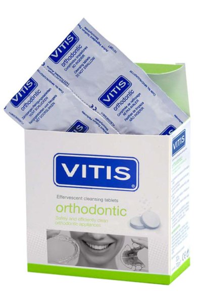 DescrizioneLe compresse effervescenti VITIS orthodontic puliscono gli apparecchi di ortodonzia rimovibili metallici ed invisibili, in modo sicuro ed efficace. Previene l’apparizione della placa dentale (biofilm) e di cattivi odori. Elimina le tinzioni proventienti dal tè, il caffè e la danneggiare le parti metalliche dei apparati di ortodonzia.