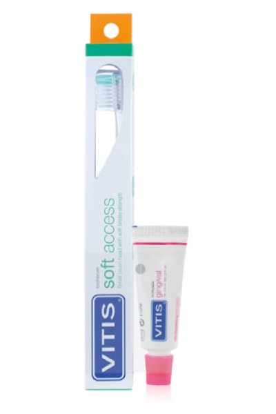 Kit composto da uno spazzolino Vitis soft Access e dal dentifricio Vitis Gingival.