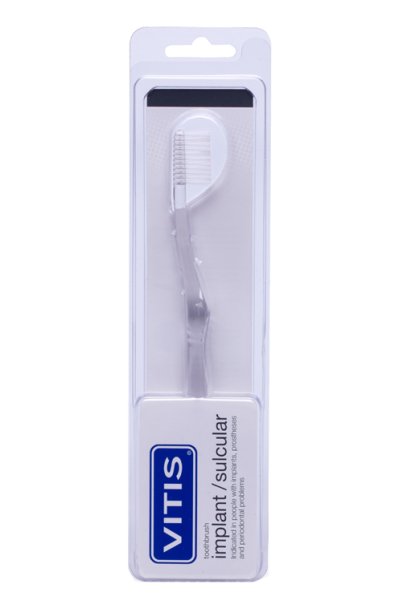 Spazzolino disegnato appositamente per facilitare l'accesso ai margini gengivali e proteggere gli impianti dentali durante la pulizia dei denti.