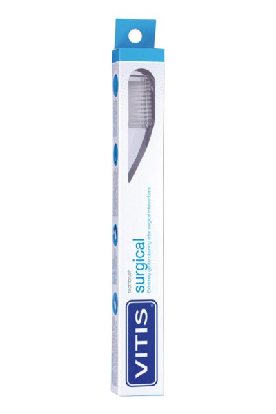Lo spazzolino VITIS Surgical ha setole estremamente morbide, con un profilo dritto per un'igiene orale delicata dopo la chirurgia, evitando così infezioni o altre complicazioni. Lo spazzolino offre il grado di durezza indicato per la pulizia della bocca durante i periodi post-chirurgici (15 giorni dopo l'intervento), da utilizzare fino all'autorizzazione del dentista per tornare ad usare uno spazzolino normale. Il collo dello spazzolino VITIS Surgical è flessibile in modo da poterlo flettere fino a raggiungere la posizione che meglio si adatta alla cavità orale. Il manico è anatomico e con strie anti scivolamento per facilitarne l'uso e la comodità durante la spazzolatura. Dispone inoltre di un cappuccio protettivo della testina che mantiene le setole raggruppate e in ottime condizioni di igiene.