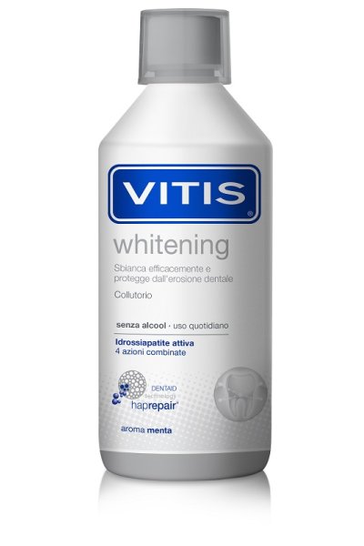 VITIS® whitening collutorio sbianca efficacemente i denti, rimuovendo le macchie ed evitandone la formazione. Restituisce ai denti il bianco e la loro brillantezza naturale. Non danneggia lo smalto.
