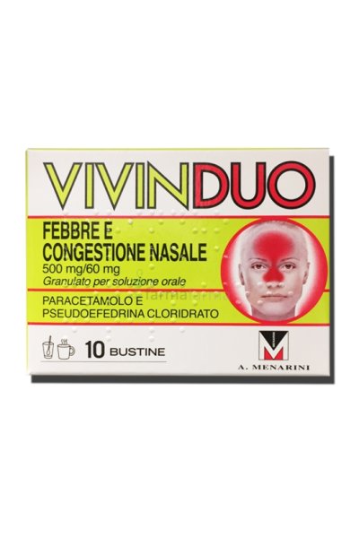 PosologiaPosologia Adulti e ragazzi al di sopra dei 12 anni di età : 2-3 bustine al giorno, disciolte in un bicchiere d’acqua. Bambini: non è raccomandato nei bambini al di sotto dei 12 anni (vedere paragrafo 4.3). Utilizzare la dose minima efficace. Iniziare, cioè, il trattamento al dosaggio minimo previsto aumentando la dose solo se i sintomi non sono sufficientemente controllati. La dose massima (sia per singola somministrazione sia per dose giornaliera totale) non deve mai essere superata. Negli adolescenti, negli anziani o nei soggetti con funzione epatica o renale compromessa può essere necessario ridurre il dosaggio in rapporto alle condizioni cliniche del paziente; in questi casi il paziente deve essere avvertito di consultare il medico prima di usare VIVINDUO FEBBRE E CONGESTIONE NASALE. Il medicinale deve essere utilizzato: 5 giorni massimo di terapia per la popolazione adulta 3 giorni massimo di terapia per la popolazione pediatrica (12-18 anni) Modo di somministrazione Sciogliere il granulato in un bicchiere di acqua e bere immediatamente la soluzione ottenuta. È possibile utilizzare anche acqua calda.