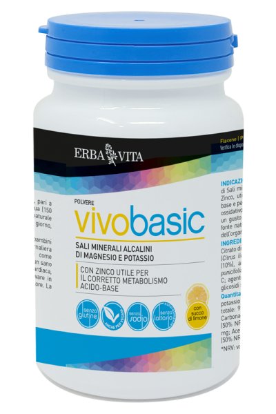 VIVOBASIC è un integratore alimentare a base di sali minerali alcalini di magnesio e potassio, arricchito con zinco, utile per mantenere un corretto metabolismo acido-base e per contribuire alla protezione delle cellule dallo stress ossidativo. Completano la formula il succo di limone, che dona un gusto gradevole alla preparazione e l’estratto di acerola fonte naturale di vitamina C, che favorisce le naturali difese dell’organismo e svolge un’azione di sostegno e ricostituente.