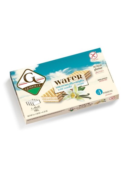DescrizioneWafers farciti con crema alla vaniglia (crema 75%) senza glutine. 3 cialde di wafer con 2 strati di farcitura alla vaniglia. Il prodotto è formulato specificatamente per consumatori celiaci ed è privo di lattosio; non ci sono comunque prescrizioni al consumo da parte del consumatore non sensibile.