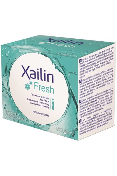 Dispositivo Medico CE 0120, classe IIa.Collirio contenente carmellosa sodica 0,5%. Quando gli occhi diventano rossi e dolenti, danno una sensazione di prurito, granulosità o bruciore, si tratta probabilmente della sensazione di occhio secco, che può essere alleviata con Xailin Fresh monodose senza conservanti. L'ingrediente lubrificante, la carmellosa, allevia i sintomi della sensazione di secchezza oculare con la sua goccia calmante. Xailin Fresh può anche essere utilizzato come soluzione idratante per lenti a contatto.