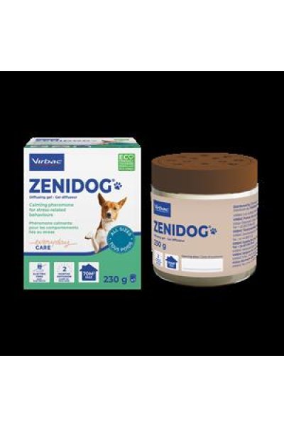 ll Diffusore in Gel Zenidog è dotato di una tecnologia innovativa che consente il rilascio continuo per 2 mesi degli analoghi dei feromoni appaganti del cane (DAP), rilasciati dalle madri durante l'allattamento. Funziona senza il consumo di elettricità.