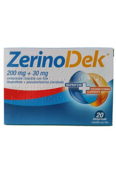 PosologiaPosologia Adulti e adolescenti di età superiore ai 15 anni: 1 compressa (corrispondente a 200 mg di ibuprofene e 30 mg di pseudoefedrina cloridrato) ogni 6 ore, se necessario. In caso di sintomi più gravi, 2 compresse (corrispondenti a 400 mg di ibuprofene e 60 mg di pseudoefedrina cloridrato) ogni 6 ore, se necessario, fino a una dose massima totale di 6 compresse al giorno (corrispondenti a 1200 mg di ibuprofene e 180 mg di pseudoefedrina cloridrato). Non si deve superare la dose massima totale di 6 compresse al giorno (corrispondenti a 1200 mg di ibuprofene e 180 mg di pseudoefedrina cloridrato). Il trattamento non deve protrarsi per più di 5 giorni Gli effetti indesiderati possono essere minimizzati con l’uso della dose minima efficace per la durata di trattamento più breve possibile necessaria per controllare i sintomi (vedere paragrafo 4.4). Questa associazione deve essere utilizzata quando sono necessarie sia l’azione decongestionante della pseudoefedrina cloridrato sia quella analgesica e/o antiinfiammatoria dell’ibuprofene. Se un solo sintomo è prevalente (congestione nasale oppure cefalea e/o febbre), è preferibile la terapia con un prodotto monosostanza. Popolazione pediatrica ZerinoDek è controindicato nei pazienti pediatrici di età inferiore a 15 anni (vedere paragrafo 4.3). Se l’uso di questo medicinale è necessario per più di 3 giorni negli adolescenti, o nel caso di un peggioramento della sintomatologia deve essere consultato il medico. Modo di somministrazione Per uso orale. Le compresse devono essere ingerite, senza masticarle, con un bicchiere abbondante d’acqua, preferibilmente durante i pasti.
