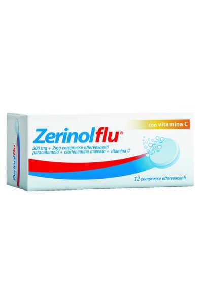 AvvertenzeNon somministrare per oltre 3 giorni consecutivi senza consultare il medico. Se la febbre persiste per più di tre giorni oppure se i sintomi non migliorano e ne compaiono altri entro tre giorni oppure sono accompagnati da febbre elevata, esantema, quantità eccessiva di muco e tosse persistente, consultare il medico prima di continuare la somministrazione. Paracetamolo Durante il trattamento con Zerinolflu controllare che non venga assunto contemporaneamente nessun altro medicinale contenente paracetamolo, poiché se il paracetamolo è assunto a dosi elevate si possono verificare gravi reazioni avverse. Invitare il paziente a contattare il medico prima di associare qualsiasi altro farmaco. Vedere anche il paragrafo 4.5. Dosi elevate o prolungate del prodotto possono provocare un’epatopatia ad alto rischio (vedere anche il paragrafo 4.9) ed alterazioni a carico del rene e del sangue anche gravi. In caso di reazioni di ipersensibilità acuta al paracetamolo (ad es. shock anafilattico), il trattamento con Zerinolflu deve essere interrotto e devono essere attuate le misure mediche necessarie in base ai segni e ai sintomi. Clorfenamina maleato Alle comuni dosi terapeutiche gli antistaminici presentano reazioni secondarie assai variabili da soggetto a soggetto e da composto a composto. L’effetto secondario più frequente è la sedazione che può manifestarsi con sonnolenza; di ciò debbono essere avvertiti coloro che possono condurre autoveicoli o attendere ad operazioni che richiedono integrità del grado di vigilanza (vedere paragrafo 4.7). Acido ascorbico L’acido ascorbico (vitamina C) deve essere usato con cautela da soggetti che soffrono, o abbiano sofferto in passato, di nefrolitiasi (calcolosi renale) e da quelli affetti da deficit di G6PD (Glucosio–6–fosfato–deidrogenasi), emocromatosi, talassemia o anemia sideroblastica. Pazienti con insufficienza renale o epatica Somministrare con cautela nei soggetti con insufficienza renale od epatica. Anziani Particolare attenzione va posta nel determinare la dose negli anziani per la loro maggiore sensibilità verso il farmaco. Nei pazienti anziani in trattamento con antistaminici si possono verificare con maggiore probabilità effetti quali vertigini, sedazione, confusione e ipotensione. I pazienti anziani sono particolarmente sensibili agli effetti secondari anticolinergici degli antistaminici quali secchezza della bocca e ritenzione urinaria (specialmente negli uomini). Zerinolflu compresse effervescenti contiene: Aspartame Questo medicinale contiene una fonte di fenilalanina. Può essere dannoso se affetto da fenilchetonuria (mancanza dell’enzima fenilalanina idrossilasi). Sorbitolo I pazienti affetti da rari problemi ereditari di intolleranza al fruttosio non devono assumere questo medicinale. Sodio Una compressa effervescente contiene 14,83 mmol di sodio. Da tenere in considerazione nei pazienti con ridotta funzionalità renale o che seguono una dieta a basso contenuto di sodio.