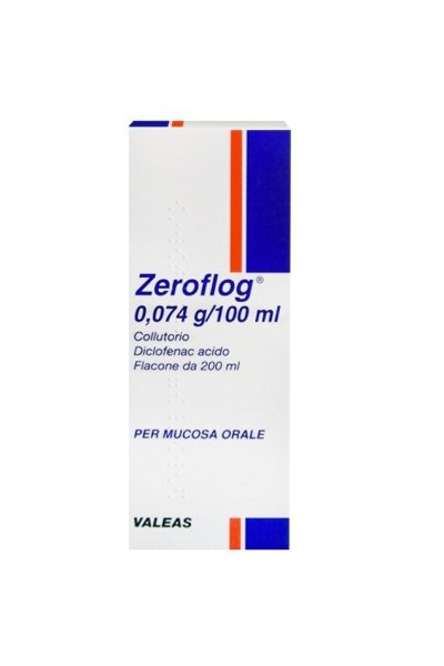 Effetti indesideratiDiclofenac è generalmente ben tollerato e raramente si manifestano effetti indesiderati. Studi clinici condotti con ZEROFLOG Collutorio hanno evidenziato, specie per trattamenti prolungati, la comparsa dei seguenti effetti indesiderati: Patologie gastrointestinali Fenomeni irritativi a carico della mucosa orale, generalmente di lieve entità. Patologie respiratorie Tosse. Negli studi clinici con ZEROFLOG soluzione spray per mucosa orale, solamente in un numero esiguo di pazienti trattati sono stati osservati i seguenti effetti indesiderati a) di entità lieve Patologie gastrointestinali nausea, dispepsia Patologie vascolari Ipotensione Patologie del sistema muscolo scheletrico e del tessuto connettivo brividi Patologie della visione alterazioni della visione b) di entità moderata Patologie del Sistema nervoso centrale cefalea Patologie della cute e del tessuto sottocutaneo alterazioni delle membrane mucose.