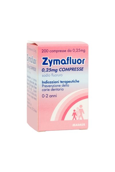 Gravidanza e allattamentoZymafluor è stato largamente impiegato per molti anni durante la gravidanza. Qualora si decida di somministrare Zymafluor durante la gravidanza e l’allattamento la dose raccomandata per la madre è di 1 compressa da 1 mg di Zymafluor al giorno (pari a 1 mg di fluoro–ioni). Il contenuto in fluoro–ioni nel latte materno, tuttavia, è trascurabile ed al bambino allattato al seno materno si consiglia di somministrare 1 compressa da 0,25 mg o, preferibilmente, vista l’età del bambino, 4 gocce di Zymafluor al giorno (pari a 0,25 mg di fluoro–ioni).