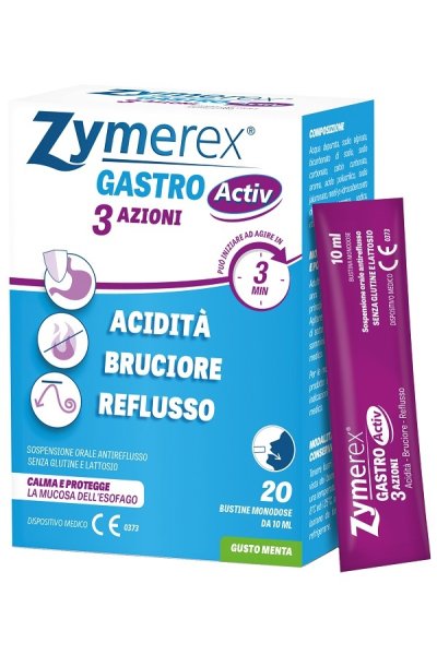 Dispositivo medico ad azione meccanica a base di sodio alginato, bicarbonato di sodio, sodio carbonato, calcio carbonato e sodio ialuronato, formulato per svolgere 3 azioni sinergiche: bloccare il reflusso acido, ridurre il bruciore e proteggere la mucosa dell’esofago. Zymerex Gastro Activ è indicato per il trattamento del reflusso gastro-esofageo al fine di ridurre i sintomi ad esso correlati, come ad esempio, bruciore, pirosi gastrica in gravidanza, esofagite da reflusso, rigurgito acido, cattiva digestione, sintomi notturni da reflusso, tosse, infiammazione laringo-faringea.