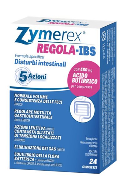 Grazie alla sua formulazione specifica, Zymerex Regola-IBS svolge 5 azioni sinergiche per favorire la normale funzionalità intestinale, inoltre, apporta circa 480 mg di acido butirrico per compressa.